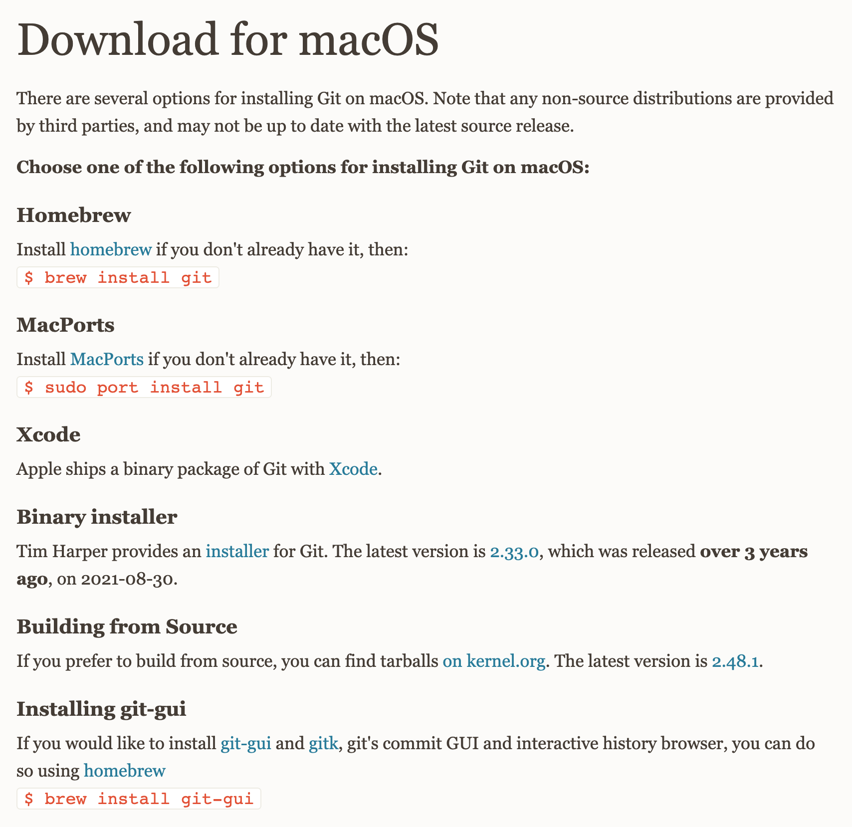 아래 Link에 따르면 macOS에서 Git 설치 방법은 6가지 중 하나를 고르면 된다고 한다.